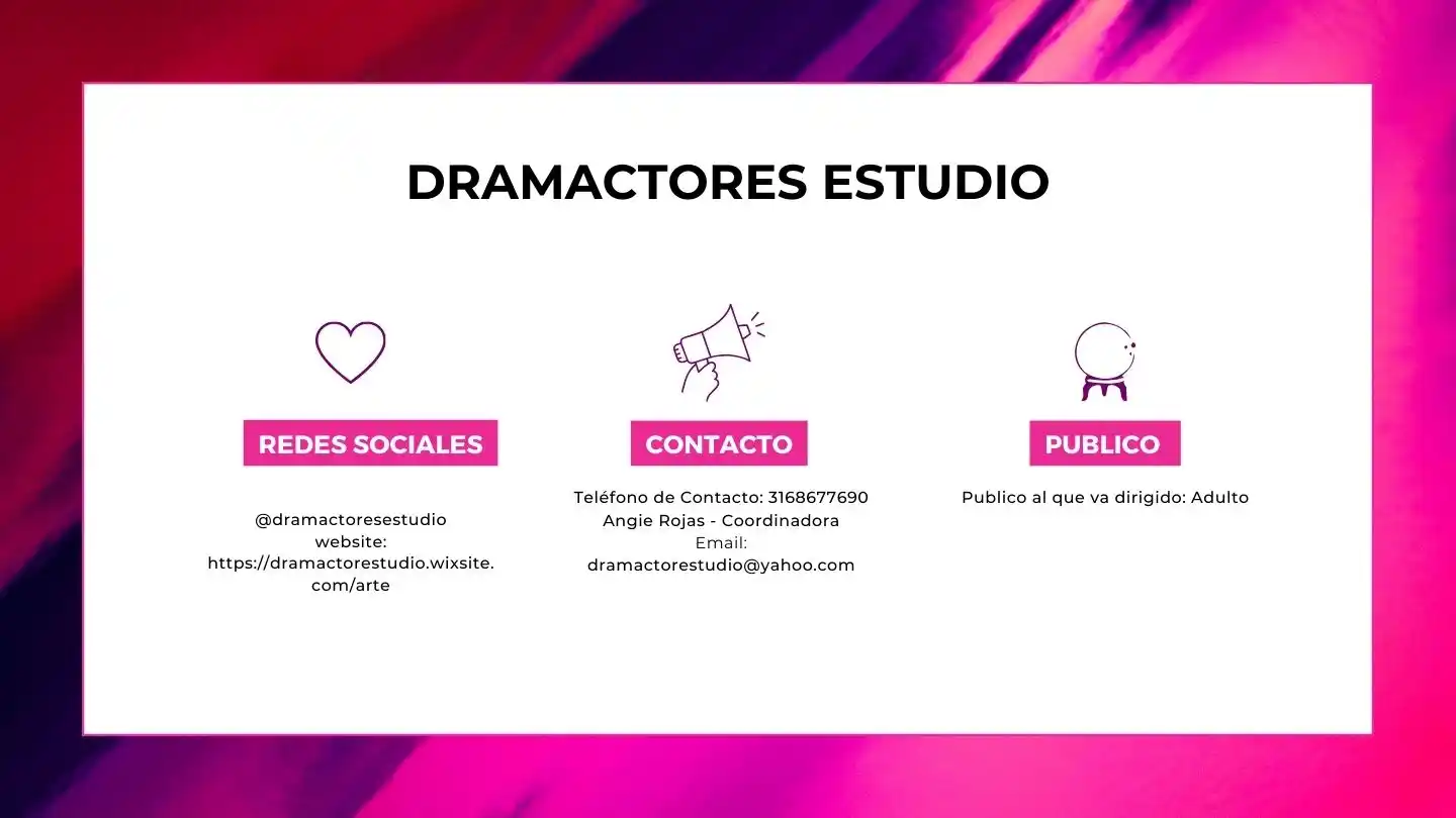 WhatsApp: +57 316 8677690 – Correo:  contacto@dramactorestudio.com – Redes sociales : @Dramactoresestudio