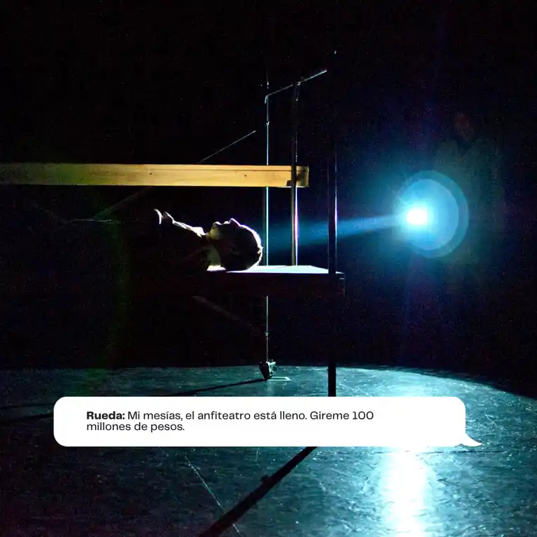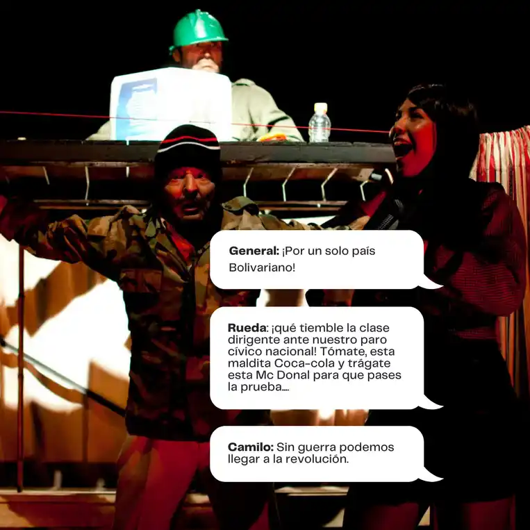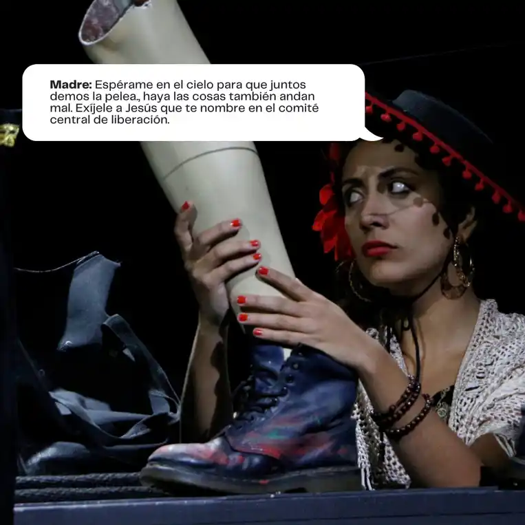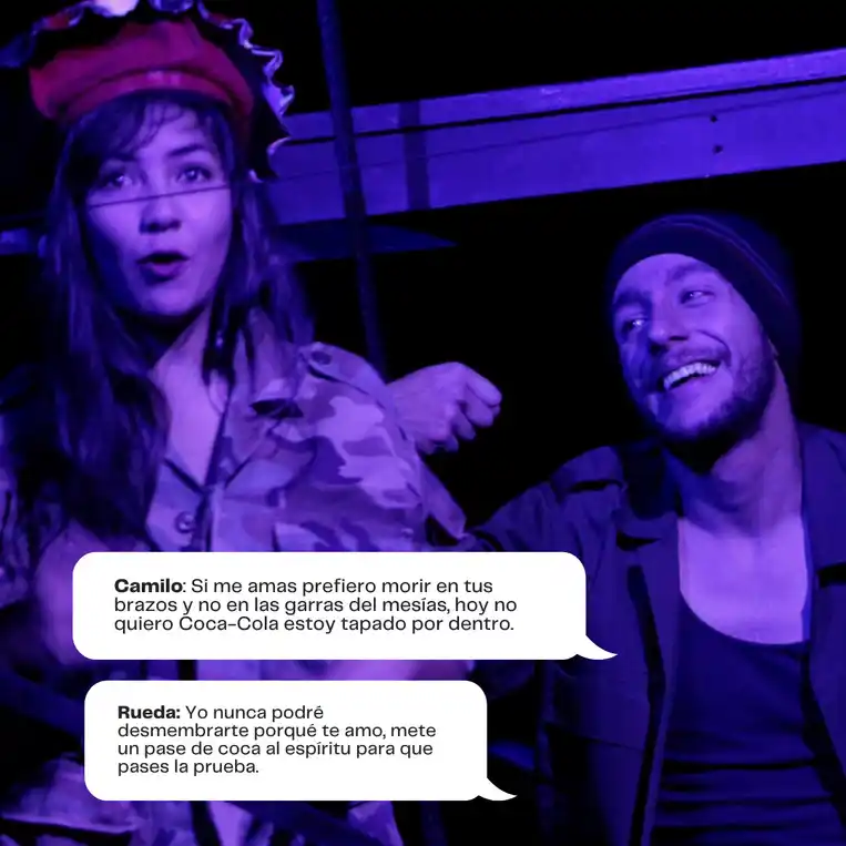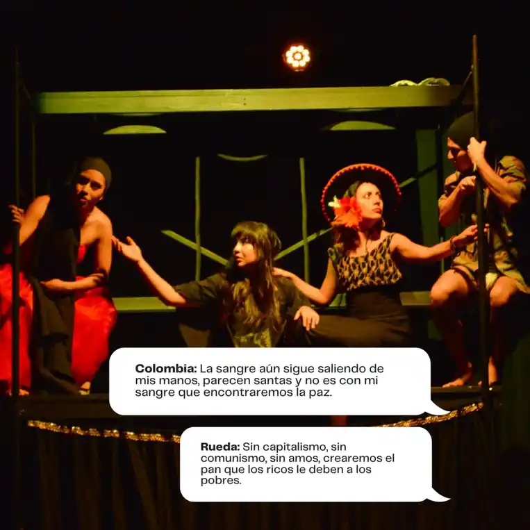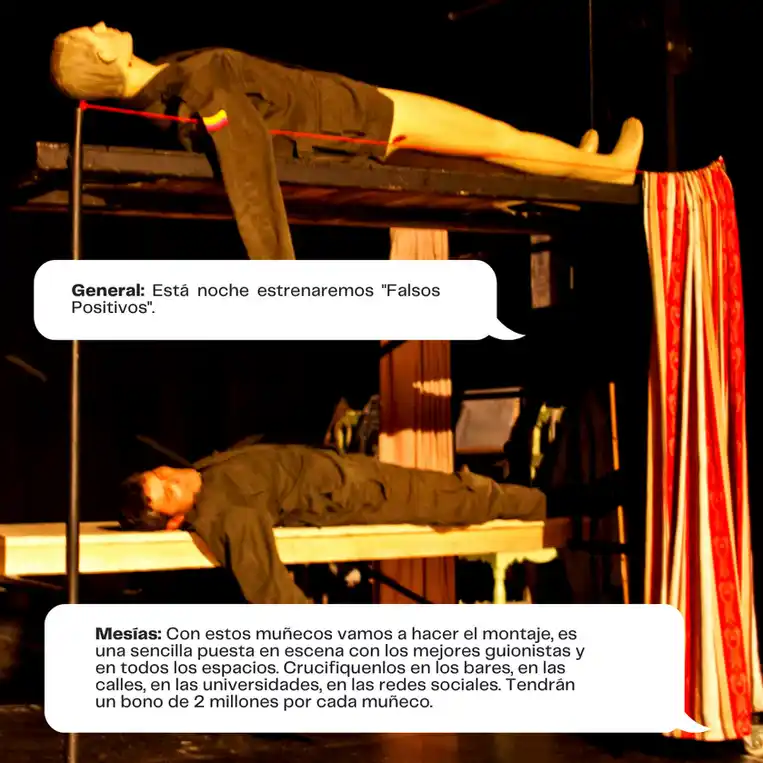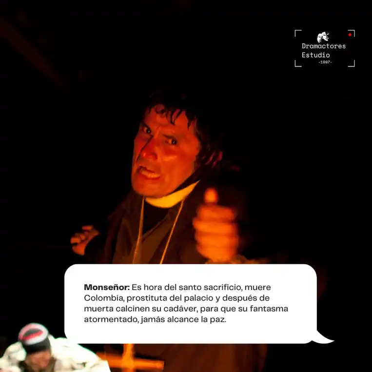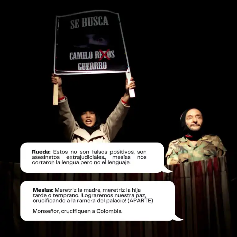 A través de una narrativa satírica y profundamente trágica, el público es testigo de conspiraciones que involucran desde líderes mesiánicos y generales corruptos hasta soldados deshumanizados que cumplen órdenes bajo promesas de recompensa. Al mismo tiempo, la figura de Colombia, encarnada como una mujer violentada y crucificada, simboliza la devastación de un pueblo sometido.