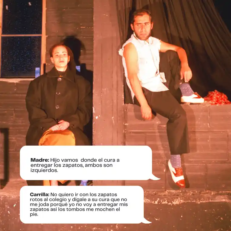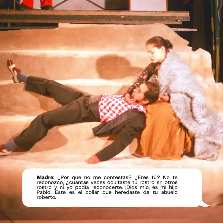 En la Escena 2, los personajes luchan con sus demonios internos. Camilo, dominado por la ira y el odio, se enfrenta a una existencia que percibe como una eterna condena. Su angustia se ve reflejada en la confrontación con su madre, el monseñor y sus propios deseos de destrucción. La atmósfera se torna surrealista cuando sus pensamientos se desdibujan en un conflicto con Dios, la moral y la razón. Este combate interno se refleja en sus violentos y poéticos diálogos, cargados de imágenes apocalípticas. La familia, el amor y la esperanza son destruidos en un grito desesperado contra un mundo que parece condenar a todos a una lucha sin sentido.