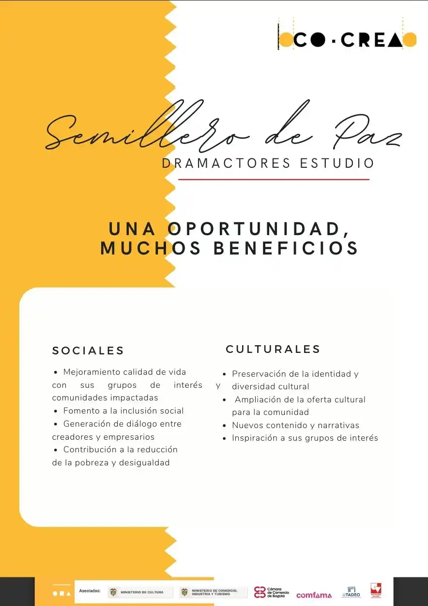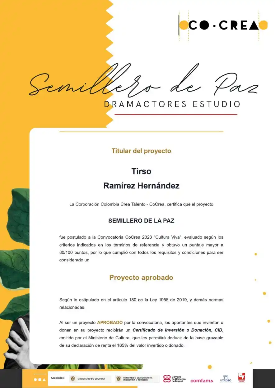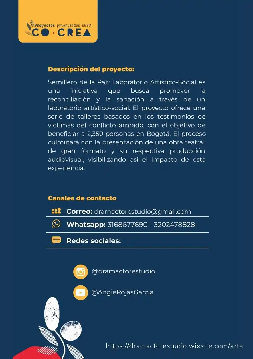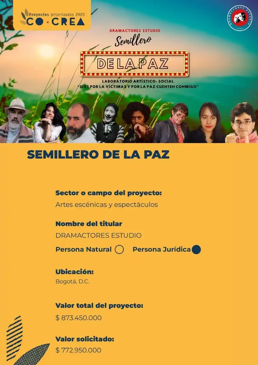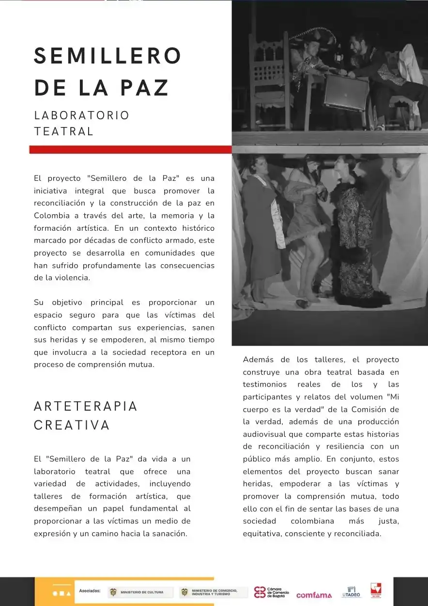 El proyecto «Semillero de la Paz» es una iniciativa integral que busca promover la reconciliación y la construcción de la paz en Colombia a través del arte, la memoria y la formación artística. En un contexto histórico marcado por décadas de conflicto armado, este proyecto se desarrolla en comunidades que han sufrido profundamente las consecuencias de la violencia. Su objetivo principal es proporcionar un espacio seguro para que las víctimas del conflicto compartan sus experiencias, sanen sus heridas y se empoderen, al mismo tiempo que involucra a la sociedad receptora en un proceso de comprensión mutua. El «Semillero de la Paz» da vida a un laboratorio teatral que ofrece una variedad de actividades, incluyendo talleres de formación artística, que desempeñan un papel fundamental al proporcionar a las víctimas un medio de expresión y un camino hacia la sanación. Además de los talleres, el proyecto construye una obra teatral basada en testimonios reales de los y las participantes y relatos del volumen «Mi cuerpo es la verdad» de la Comisión de la verdad, además de una producción audiovisual que comparte estas historias de reconciliación y resiliencia con un público más amplio. En conjunto, estos elementos del proyecto buscan sanar heridas, empoderar a las víctimas y promover la comprensión mutua, todo ello con el fin de sentar las bases de una sociedad colombiana más justa, equitativa, consciente y reconciliada.